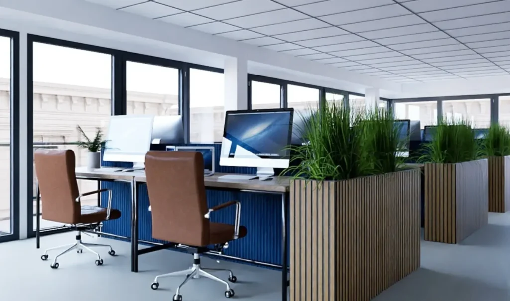 Notre exemple déco : Un open space avec plafond blanc équipé de panneaux LED encastrés en grille régulière, complétés par des lampadaires noirs à éclairage indirect placés entre les postes. La lumière reste uniforme, sans zones d’ombre, même en fin de journée.