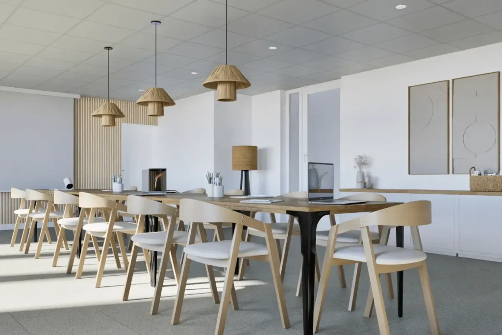 Notre exemple déco : Une table de réunion en bois massif clair, format rectangulaire, entourée de chaises tapissées aux lignes épurées dans un tissu beige ou terracotta. Au-dessus, une suspension linéaire en laiton brossé avec diffuseur opalin, réglable en intensité, permet d’ajuster la lumière selon les usages, réunion, visio ou présentation.